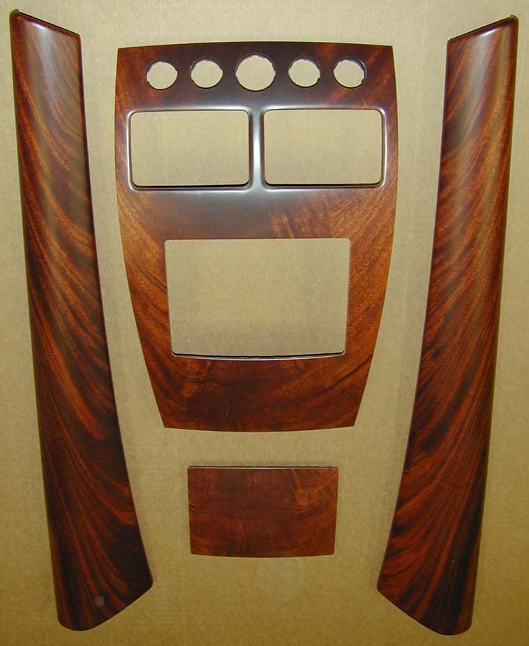 Below are pictures of the woodwork in a 2000 Aston Martin DB7. The effects of UV exposure, heat and time have affected the parts differently. Some parts appear to be in pretty good shape “colorwise”, but are developing hairline cracks in the finish. The console and ashtray changed color differently over time, and the finish on the center vent panel and the radio / temperature control panel turned very “cloudy”. Because each of these conditions affect the veneer on these parts differently, it is essential to refinish all the parts at one time.