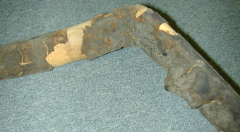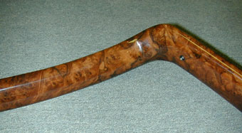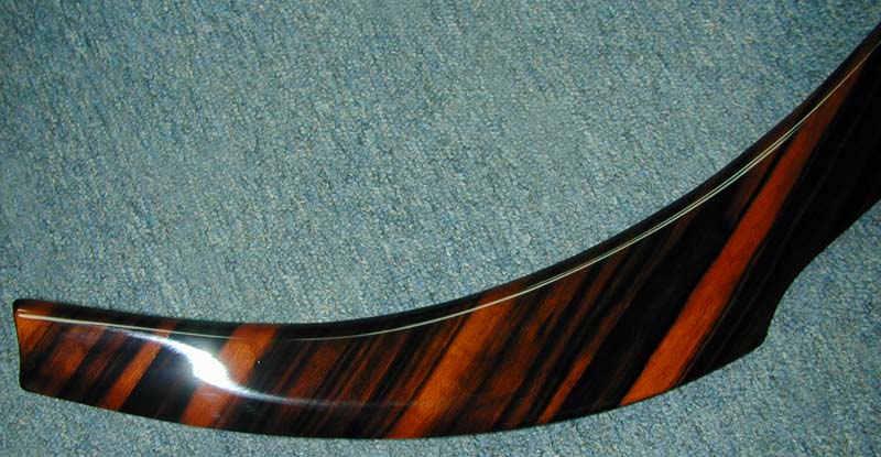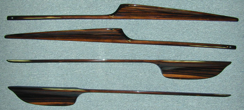 Above is an example of the Windscreen Rail after we Reveneered it in Macassar Ebony. Please Note: Because all trees are different in wood grain pattern and coloration, this picture is for general reference only. However, it is typically what Macassar Ebony looks like. Also, the camera flash made the color, especially the lighter stripes look redder than normal. |