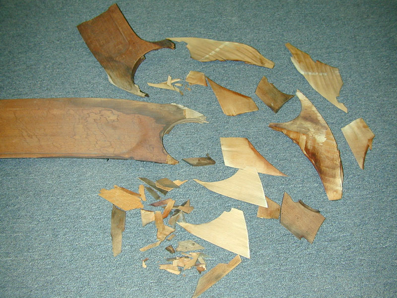 Below are pictures from a 1972 Mercedes-Benz 600. When we got this set of woodwork from our customer, it was in very very poor condition.....ESPECIALLY the ends of the Windshield "Trinket Tray" Bow. Both ends of it had suffered major water damage. The veneers in the base substructure had delaminated, rotted away at each end and most of those pieces had been lost. Just so you get an idea of how bad it was, we placed both ends and the assorted fragments that were left, in the picture below! |