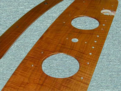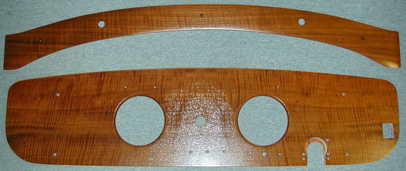 We Reveneered the Dash Cap and Dashboard of this 1939 Bugatti Cabriolet with Fiddleback Walnut. The customer requested that the finish not completely fill the grain pattern so that it had the same finish texture as original. Unfortunately the flash of the camera extremely exaggerated that effect in this picture. |
