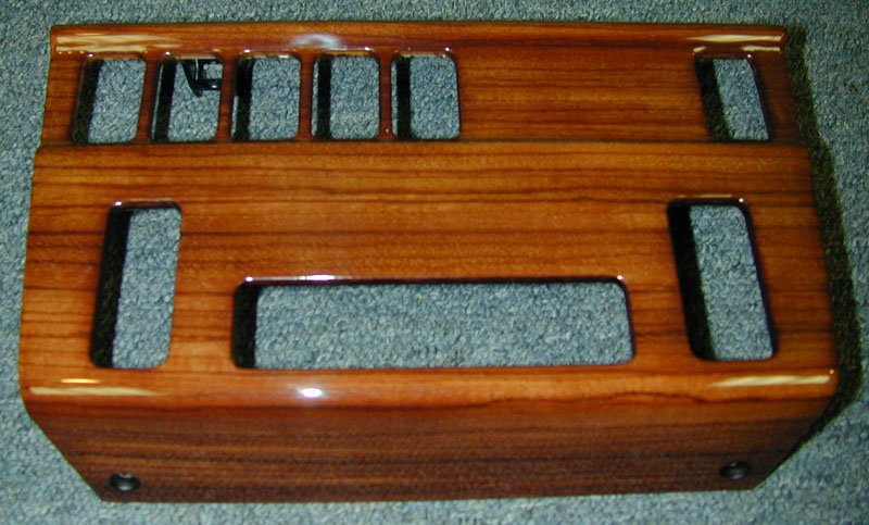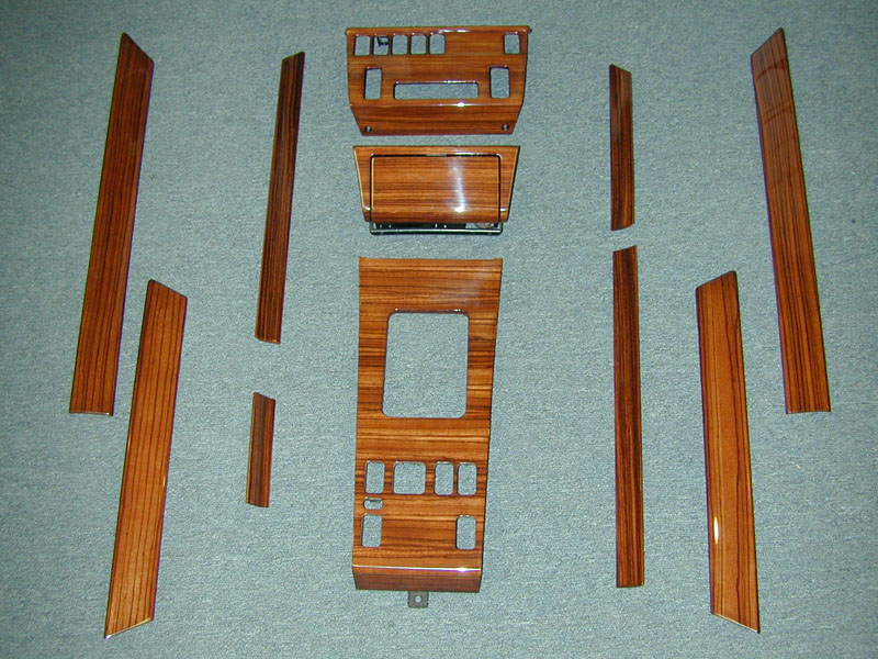 This picture shows all the woodwork from their car. When we got their woodwork, the finish was cracked all over, but fortunately, the stock wood veneer had not been adversely affected - so we were able to Refinish their parts. They were thrilled with the results. |